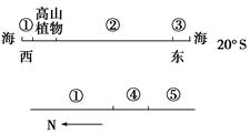小题2:①在大陆西岸,为热带荒漠带;②是热带草原带;③是热带雨林带;④是亚热带常绿硬叶林带;⑤是温带落叶阔叶林带。所以自然带④对应的气候特征是夏季炎热干燥,冬季温和多雨。选项B正确。