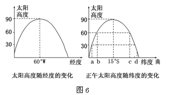 5、单选题  读下列太阳高度随经度和纬度变化示意图(图6),回答问题。