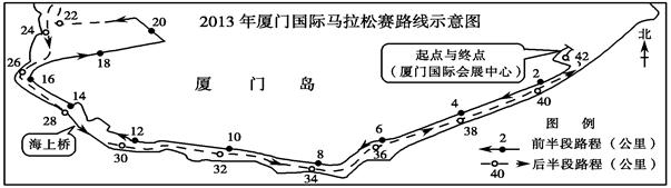 2、单选题  2013年厦门(北纬24°27′,东经118°06′)国际马拉松赛事于北京时间1月2日上午8:05鸣枪开赛。图为2013年厦门国际马拉松赛路线示意图。当某女运动员到达全程赛事终点时,她的身影向正北并大致与身高相等。读图,完成下题。