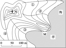 本题解析:1.本题考查等高线地形图的判读,根据M处有等高线的相交,所以判断M处为陡崖地貌,陡崖形成的原因可能是海浪的侵蚀和岩层的断裂。而珊瑚淀积和泥沙堆积一般形成珊瑚岛和河口三角洲等。所以本题选择AC选项。