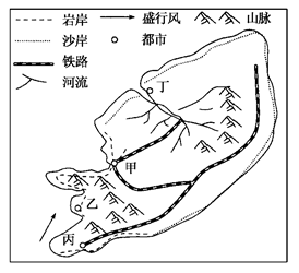 【小题1】港口的区位条件主要有:自然条件包括水域条件要江阔水深,空间大;陆域条件是平原或三角洲,地形平坦。社会经济条件要交通便利、经济腹地广,以城市为依托。由图可知甲处为岩质海岸泥沙不易淤积,该地盛行西南风。甲处位于背风的港湾,有城市为依托且有铁路相连,港口条件最好。故选项A正确。