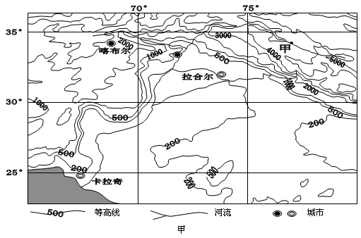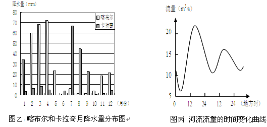 材料二:图乙为区域图中表示喀布尔和卡拉奇两地的降水季节分配图,图丙为甲地河流流量的时间变化曲线(甲地降水稀少,且水源补给形式以冰雪融水为主)。