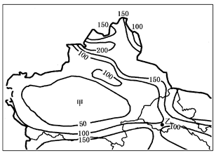 【小题1】通过读图分析:乙地处于数值为100和150的等值线包围之中,其数值范围为100~150,但因乙地距离数值为100的等值线较近,其最有可能的数值是110。因此C正确。