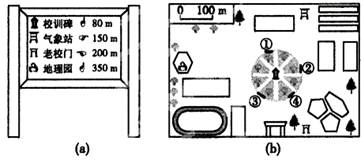 2、单选题 下图(a)为某校地理小组设计的校园景观指示牌,下图(b)为校园图局部。读图,回答下题。