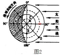 (3)读图2(图中虚线分别为回归线和极圈,阴影部分表示黑夜),该图中C点(在极圈上)的昼长是: 小时,该日淮安的昼夜长短状况是: 。与图2表示的节气一致的是图1中的哪个图 (填A、B、C、D)。
