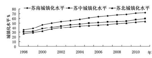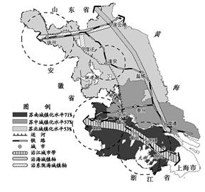 (1)根据图例分析:由于苏南、苏中和苏北地区经济社会发展水平的差异,苏南经济发展水平最高,苏北地区经济发展水平低,所以苏南城镇化水平达到71%,苏中城镇化水平为57%,而苏北地区城镇化水平为53%。城镇化水平由南向北逐步降低。