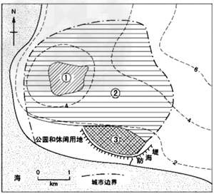 3、单选题  读“欧洲西部某沿海城镇功能分区图”,图中的虚线为等高线(单位:米),防海堤是为应对海平面上升1 米而设计的。据此回答1-3题。