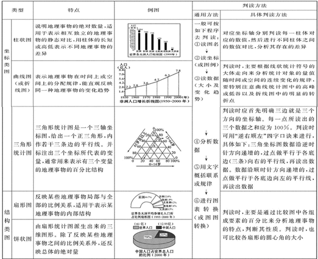 点评:本题难度较小,学生只要掌握相关地理统计图的判读方法即可。图解各种统计图的特点与判读方法:
