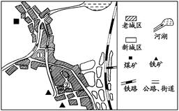 本题解析:该题要抓住图中信息回答,图中显示老城区沿河分布,新城区沿铁路线分布,另外老城区附近还有煤炭、铁矿分布。