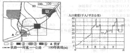 3、综合题 读我国华北某城市示意图(①居住区,②商业区,③工业区,④文化区),右图为甲丙沿线居住人口密度分布状况。据图回答问题。(10分)