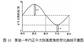 5、单选题 图10中,当?a、c值相差为20°时,该地的纬度值是