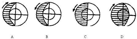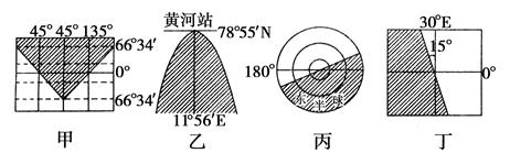 4、单选题 读图,阴影表示夜半球,内圆表示极圈,中心表示极点,箭头表示地球自转方向,其中北半球昼最短夜最长的是