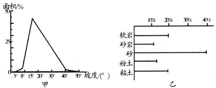 2、综合题 下图中的甲为某滑坡区域坡度面积频率分布图,乙为某滑坡区域土质分布图。读图回答有关问题。