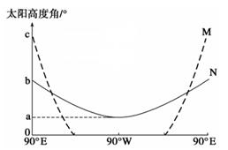 4、单选题 下图示意北京时间某时刻M、N两条纬线上不同经度的太阳高度变化。读图完成下列各题。