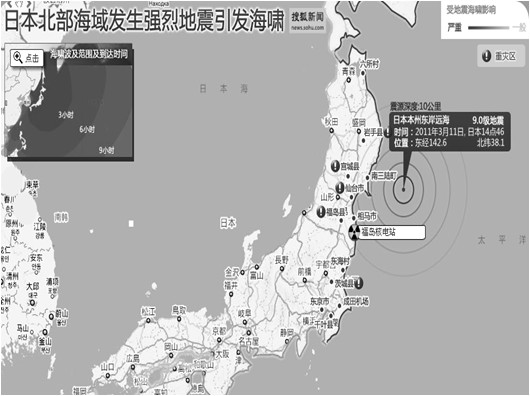 3、综合题 读日本2011年3月11日地震位置图,回答1~2题
