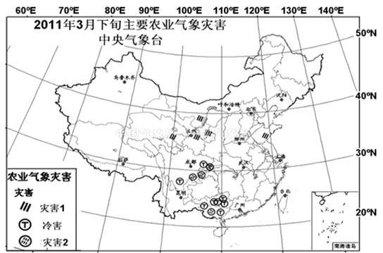 1、单选题 图为2011年3月下旬我国主要农业气象灾害,读图判断,灾害1和灾害2分别是