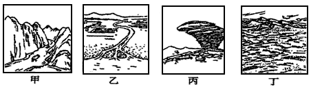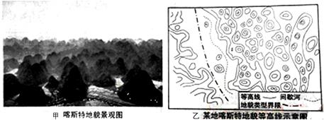 (1)图甲所示的地表喀斯特地貌主要分布于图乙中地貌类型界限以_______(填方位),该区域出现的地下喀斯特地貌类型可能有_________。(2分)