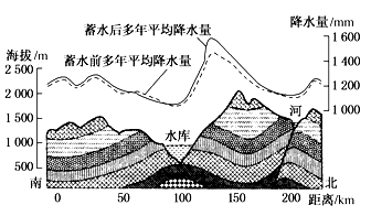 3、综合题 下图为“我国南方某地区地质构造和水库修建前后降水量变化示意图”。读图完成下题。(18分)