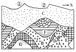 5、单选题 该图为某地地质剖面图,其中C为沉积物,B、F、G为沉积岩,A、D为不同时期的岩浆岩,E为变质岩。据此回答问题。