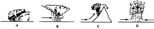试题分析:冷锋是冷气团主动向暖气团运动的,暖气团被迫抬升,降雨多在锋后,故B为冷锋;图中A位暖锋天气,C为地形雨示意图,D为对流雨示意图。