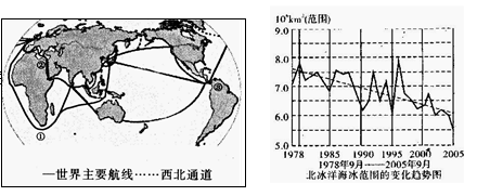 1.如果西北通道进入大规模商业运营阶段,下列国家经济受冲击最大的是2.根据北冰洋海冰的变化趋势预测,阿拉斯加未来可能出现的变化是