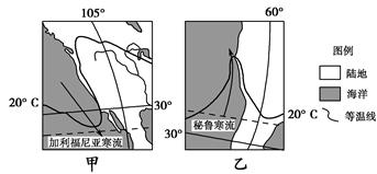 (1)根据图中经纬度和海陆轮廓可判断出,甲图中陆地为北美洲局部,乙图中陆地为南美洲局部。甲、乙两图中陆地等温线都向高纬凸出,因此图中所示地区都处于夏季。