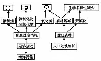 (1)在图中①②③处填上相应的全球性环境问题:①?、②?、③?(3分)