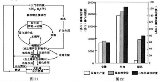 4、综合题 图21为生态系统中的硫循环示意图,图22为我国三省原煤生产量、煤炭消费量和二氧化硫排放量柱状图。读图回答问题。(10分)