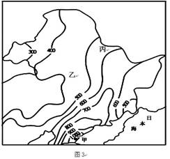 1、单选题 读图3东北地区年降水量分布图(单位:mm),完成问题。