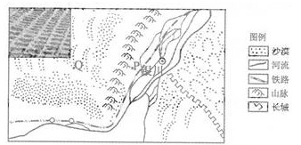 4、单选题 下图是我国西部某地区略图,图中左上方所示为当地铁路沿线的草方格沙障。读图回答问题。