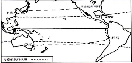 4、综合题 我国的一艘综合科考船与今年2月20日从上海港出发,沿下图所示船行线路经圣弗朗西斯科——利马——悉尼,再对澳大利亚大陆进行考察。根据所学知识,回答问题。