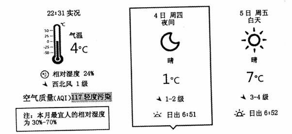 1、单选题 下图为上海市区(31.20°N, 121.50°E)某月4日的天气状况与5日预报截图,据此回答以下问题。