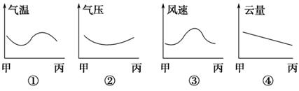 小题2:下列四幅图中,能表示甲地至丙地之间气象要素变化的是? ( )。