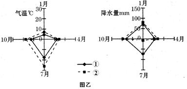 【小题2】图乙所示①②气候类型与图甲中甲、乙、丙、丁四地气候类型相符的有( )