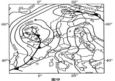 5、单选题 图甲是2013年5月15日14:00欧洲部分地区海平面等压线分布图,图乙是①②两种气候类型的气温与降水量图。读图回答下列各题。
