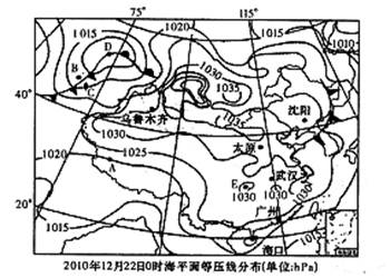 【小题2】等压线密度越密集,风力越大,图中四个城市中,广州处等压线密度最大,风力最大。