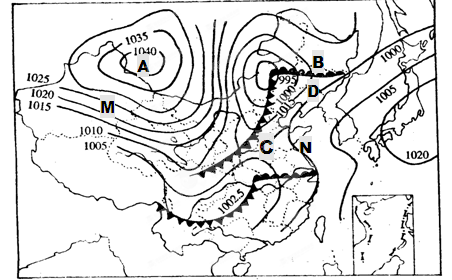 2、综合题 读我国1月地面天气形势图,回答下列问题(7分)
