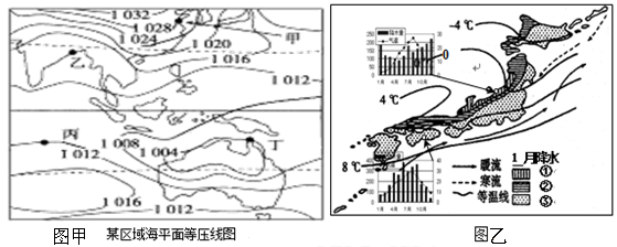 (2)在图甲甲乙丙丁四地中,风速最大的是 ,丙地吹 风。在图乙中,日本本州岛的北部沿岸冬季多雨雪,这与冬季风途经 海,带来丰富的 有很大关系。(8分)