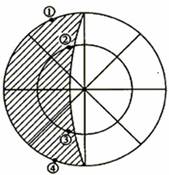 1、单选题  2004年3月22日到4月3日期间,可以看到多年一遇的“五星连珠“天象奇观。其中水星是最难一见的行星,观察者每天只有在日落之后的1小时内可能看到它。在图中阴影部分表示黑夜,中心点为极地。回答下列各题。