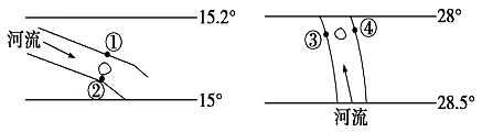 本题解析:左图中纬度值向北增大,为北半球,地转偏向力向右,小岛最终可能和左岸(④)相连;右图中纬度值向南增大,为南半球,地转偏向力向左,小岛最终可能和右岸(④)相连。