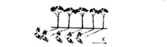 5、单选题 读“我国某城市(117°E,32°N)某时刻道路行道树及树影示意图”,完成以下问题。