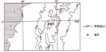 本题解析:考查区域等高线地图气温特点和成因判读.考虑到基多位于赤道高山(海拔接近3000米)位置,赤道地区海平面常年高温(大于25°以上),考虑到山地气温递减(每上升100m气温降低6°),基多大约常年温度在17°(25°-18°)左右,气温应该"终年温和",年温差较小,但由于山地影响昼夜温差较大(昼夜对太阳辐射的影响大).