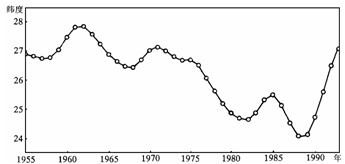 4、单选题 西太平洋副热带高压脊线位置的年际变化与我国东部地区降水的变化密切相关,我国锋面雨带的位置大约在副热带高压脊线以北约5°~8°。读近几十年来7~8月西太平洋副热带高压脊线所在纬度位置波动示意图,回答下列各题。