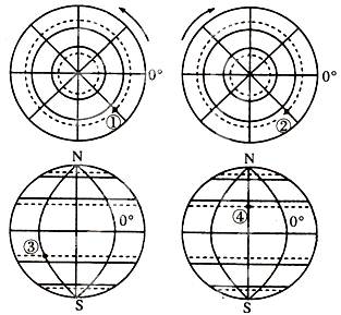 【小题2】下列四幅图中,经纬度位置相同的两点是(0°为经度、虚线为回归线和极圈) ( )