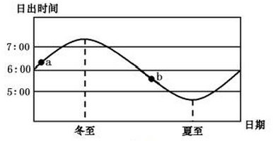 1、单选题 某同学对我国某地(地处120°E)每天的日出时间进行了一段时间的持续观测与记录,绘成图。读图完成下列小题。