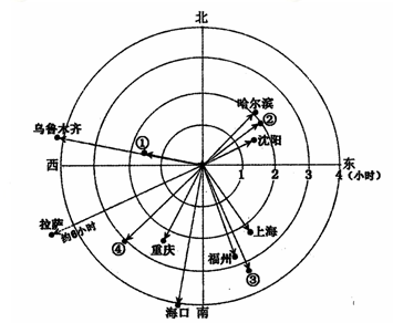 5、单选题 下图示意以北京为起点飞往我国部分直辖市或省级行政中心的方向和时间。读图,回答下列问题。