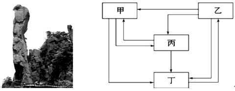 1、单选题 左图表示巨蟒出山风景,它是江西三清山的标志性景观,海拔1200余米,相对高度128米,是由风化和重力崩解作用而形成的巨型花岗岩石柱。右图为地壳物质循环示意图。结合相关知识完成下列各题: