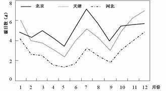 1、单选题 在风力较小、逆温、相对湿度较低的情况下,随着悬浮颗粒物的增多而导致大气能见度小于10千米的现象叫霾。图为北京、天津、河北三省市各月霾日数变化图,读图完成下列各题。