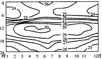 3、单选题 下图为“某地一年中气温日变化的分布图(单位:℃)”,读图回答1—2题。