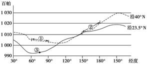 5、单选题 该图是“某月份海平面平均气压沿两条纬线的变化图”,分析回答问题。